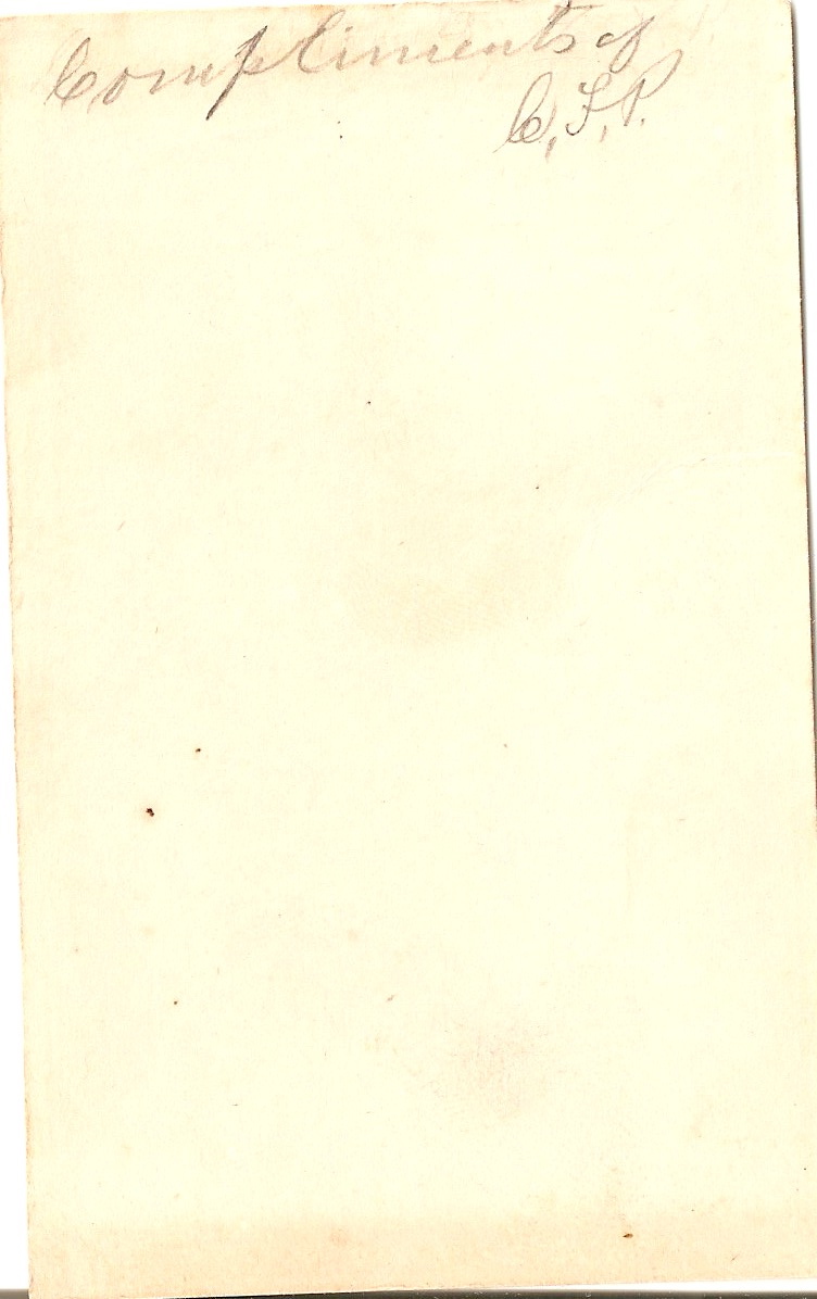 My estimate for the age of the young man is perhaps between twenty-five and thirty; his high hairline suggests to me that he is probably not much younger. His apparent age suggests a date of birth between approximately 1830 and 1840, depending on the year that the photograph was taken. Perhaps he was unmarried when he inscribed this photograph and presented it to a young lady he admired; of course, it could also have been given to a family member or friend. Did C.F.P. serve in the Civil War? Although he is not in uniform in this photograph, that doesn’t mean that it might not have been taken as a memento for his loved ones before he left home.