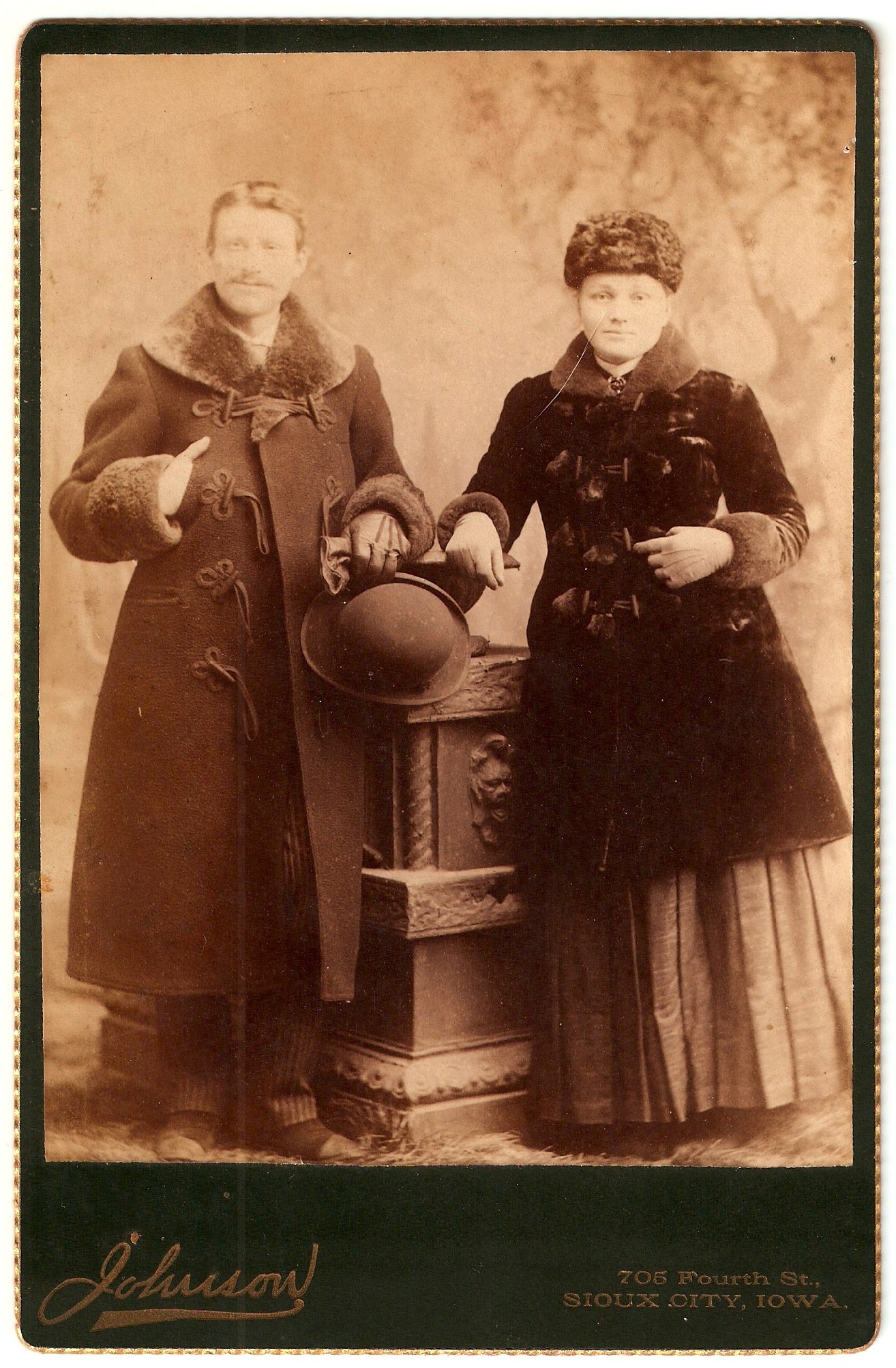 This Valentine’s Day, perhaps you’re looking forward to a special outing with a loved one. You might dress up, or you might bundle up, depending on the temperature outside. In any case, you likely won’t be decked out in fashionable furs like this couple, who dressed for the winter weather in Sioux City, Woodbury County, Iowa circa 1889. This cabinet card photograph comes from an unidentified antique album featuring a family of Swedish immigrants.1 The photographer – J. E. Johnson of 705 Fourth Street in Sioux City – operated his studio from at least 1887-1891.2