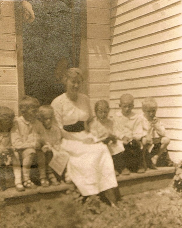 Andrea Nelson at a schoolhouse with her students, Yankton County, South Dakota, ca. 1916-1918; digital image 2012, privately held by Melanie Frick, 2018.