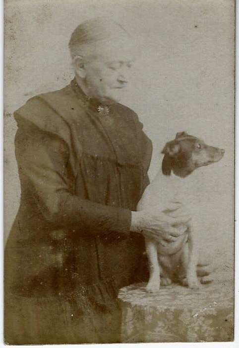 This is not the most straightforward photograph to date, particularly as older women may not have worn the latest fashions. However, an approximate date after 1900 seems reasonable; for one thing, by that point, I suspect that photographs—even in a small village in Denmark—would not have been so unusual or costly that it would have been unthinkable to be photographed with a pet.