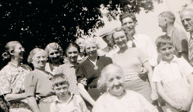 Back: Anna (Lutz) Catlin, Permelia Adam, Melanie (Lutz) Adam, Adelheid (Brandt) Rindfleisch, Elsie (Rindfleisch) Beyer, Mary (Grover) Rindfleisch, Alfred Beyer, Helen (?) Catlin, Vance Catlin, Edward Rindfleisch, Henry Adam, and Front: Keith Beyer, Hedwig (Cichos) Lutz Rindfleisch, and Albert Rindfleisch, Danville, Blue Earth County, Minnesota, circa 1937-39; digital image 2010, privately held by Melanie Frick, 2019.