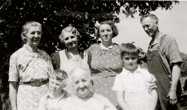Back: Anna (Lutz) Catlin, Melanie (Lutz) Adam, Elsie (Rindfleisch) Beyer, Edward Rindfleisch, and Front: Keith Beyer, Hedwig (Cichos) Lutz Rindfleisch, and Albert Rindfleisch, Danville, Blue Earth County, Minnesota, circa 1937-39; digital image 2010, privately held by Melanie Frick, 2019.