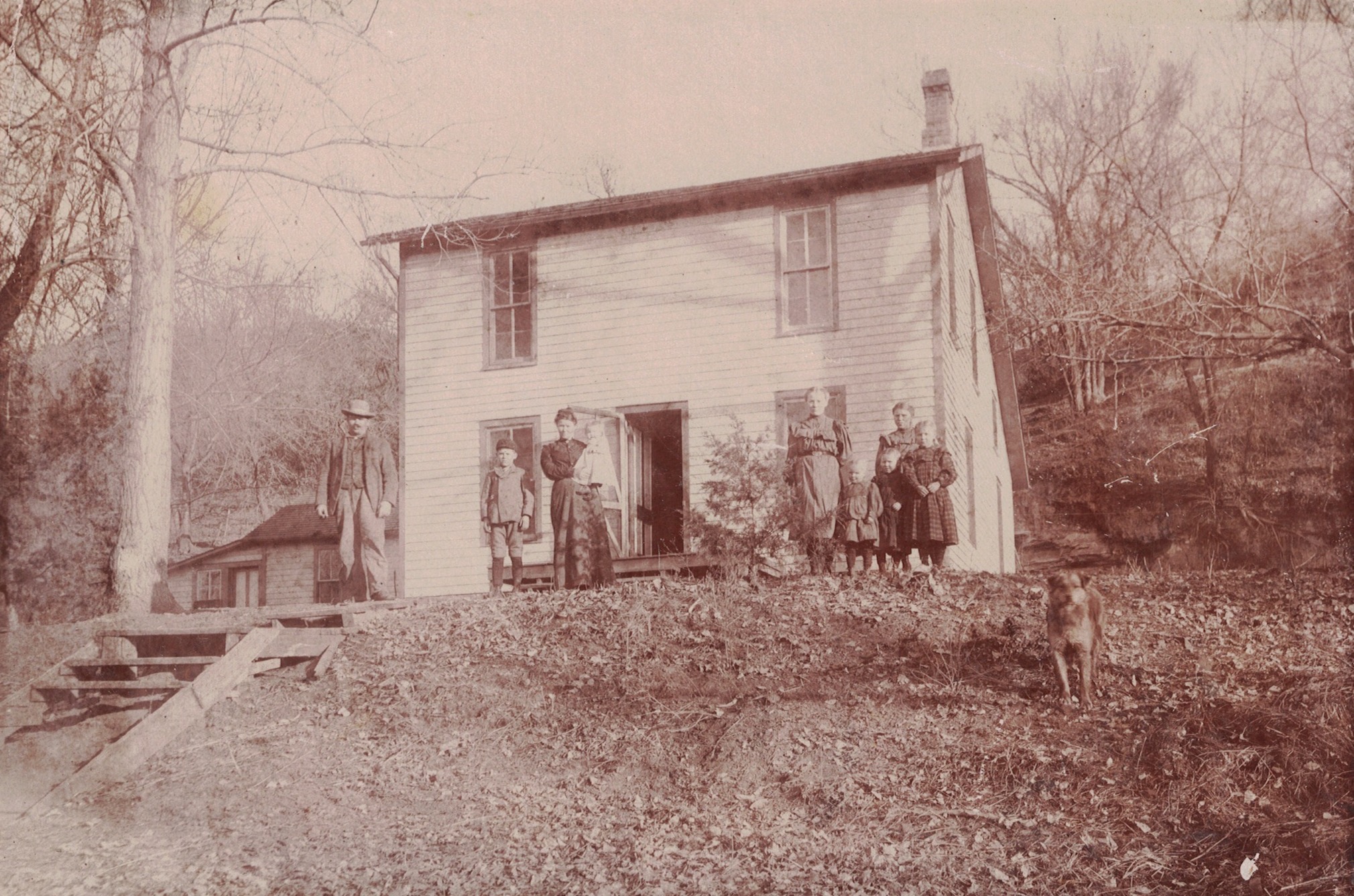 The leaves had already fallen from the trees surrounding the modest two-story farmhouse belonging to Fred and Christina (Schmidt) Nelson when this photograph was taken in late 1904.1 Situated near the scenic bluffs along the Missouri River west of Yankton, Yankton County, South Dakota, the house was said to have had a creek running through the corner of the kitchen as a source of fresh water.2 Its simple, symmetric design featured a center door and four front windows on its clapboard walls, with a chimney appearing above the gable roof on one side. The house was likely painted white with a trim of a different color around the windows and door. Many trees surrounded the house, which was situated on an incline; the remote, wooded landscape seems to lend truth to family lore of the children fearing howling wolves (or coyotes?) as they walked to and from the nearest country school.3