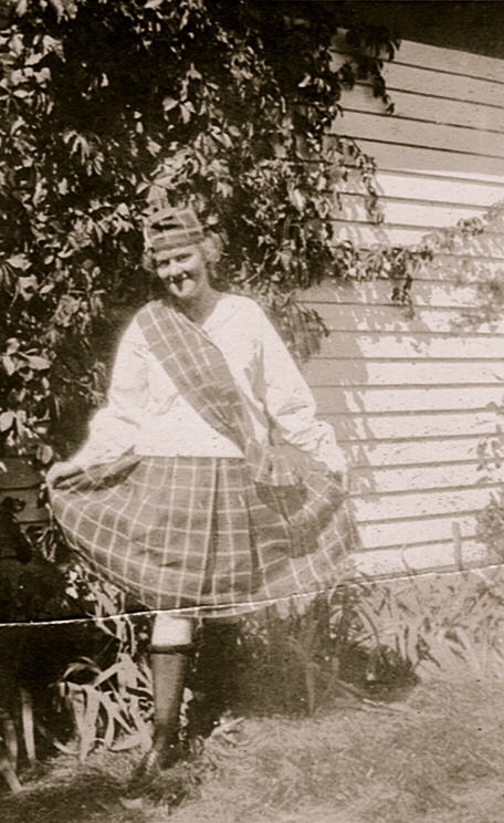 Seated to the right of Herta Scheel Callesen is her cousin Cleora Nielsen, the youngest daughter of John and Mary (Jacobsen) Nielsen. Cleora, eight years old, had been born in South Dakota but now lived in Santa Clara County, California. She and her parents had most likely returned to South Dakota for a summer visit with relatives; it is possible that her older siblings, the youngest already sixteen, remained in California, as they are not pictured here.